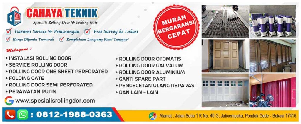 Cahaya Teknik merupakan penyedia Jasa Pemasangan atau Pembuatan pintu rolling terbaik di Jalan Setia 1 K No. 40 G, Jaticempaka, Pondok Gede – Bekasi 17416,. Kami telah bertahun – tahun berpengalaman dalam bidang pemasangan pintu rolling. Kami biasa melayani pemasangan dan pembuatan pintu rolling di daerah Jabodetabek dan sekitarnya, kami mengerjakan produk kami untuk rumah, toko, gudang, garasi, ruko, dan sebagainya.